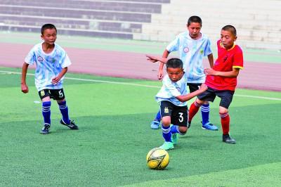 在贵州榕江县古州镇第六小学,学生们在“班超”足球赛中拼抢。新华社发