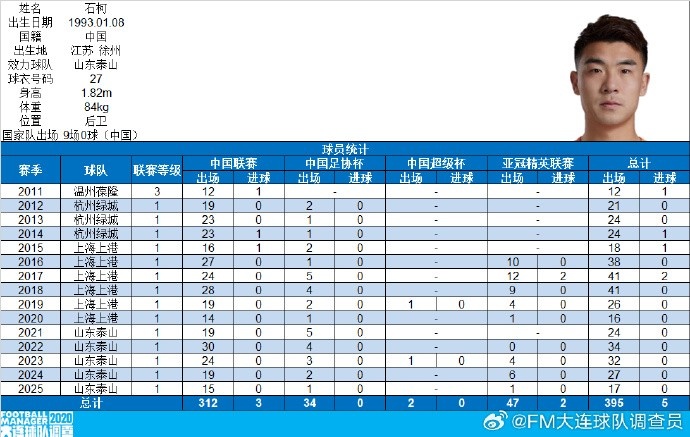 8月17日讯 据博主“FM大连球队调查员”统计,山东泰山球员石柯在泰山客场对阵新鹏城的比赛中,完成个人在中国顶级联赛出场300场的里程碑,成为第52位达成此项成就的球员,93年龄段第1人。