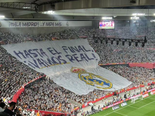 皇马上演的这些闹剧多少让国家德比“变味”,但却没有阻挡球迷们的热情。笔者比赛当天下午从马德里启程去往塞维利亚时,身披皇马和巴萨球衣的球迷随处可见,他们成群结队走上火车。卡尔图哈球场位于塞维利亚市郊,笔者抵达球场时距离开球只有十几分钟,现场氛围已然拉满,两队球迷拉起Tifo并相互飙起战歌,球场内的灯光秀也让决赛的氛围瞬间高涨。